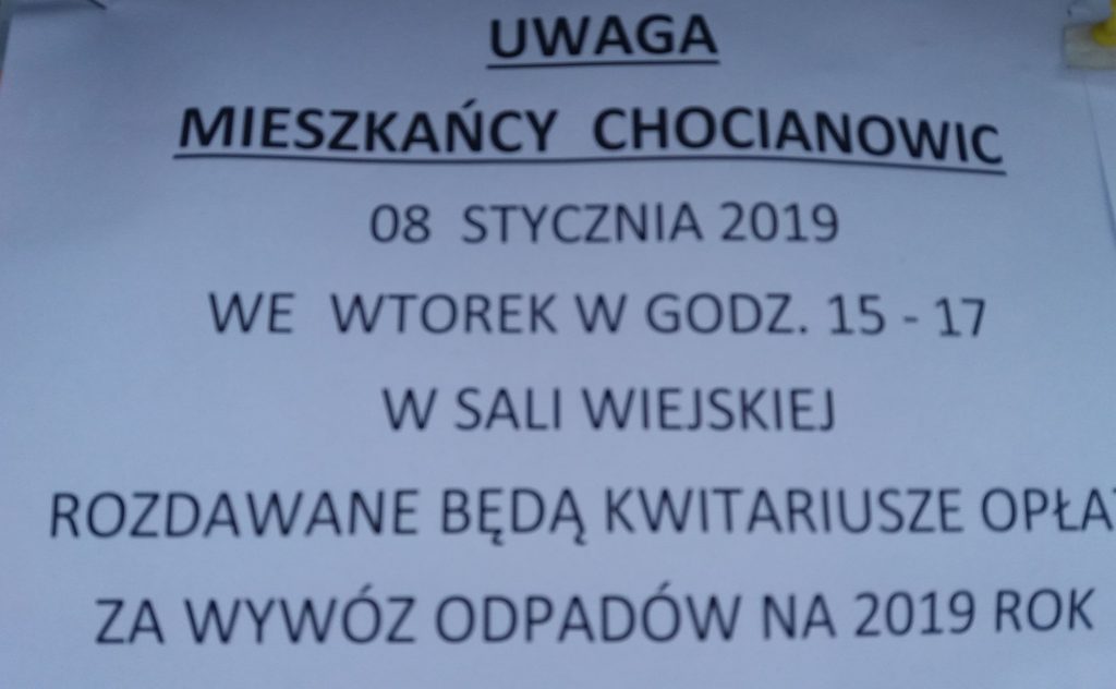 We wtorek 8 stycznia 2019 godz. 15-17 w sali wiejskiej rozdawane będą kwitarziusze opłat za wywóz odpadów na 2019 rok!