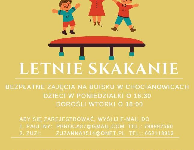 Szanowni mieszkańcy, Grupa nieformalna Chocianowickie Kangury zaprasza wszystkich chętnych na bezpłatne zajęcia fitness na trampolinach.Zajęcia odbędą się w grupach 7 osobowych.Harmonogram spotkań zostanie ustalony w terminie późniejszym. Zgłoszeń na zajęcia proszę dokonywać u wolontariuszy, telefonicznie bądź mailowo: 1. Paulina Broca ...